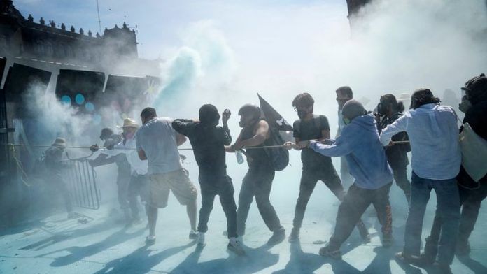 In Mexico City, a small group of hooded protesters tore down fences around the National Palace where President Claudia Sheinbaum lives, prompting a clash with riot police who deployed tear gas, according to Reuters witnesses.