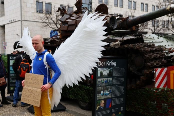 Berlin (Reuters) – Activists protesting against Russia’s invasion of Ukraine parked a destroyed, rusty tank directly in front of the Russian embassy in Berlin on Friday, bringing a piece of the battlefield to the centre of the German capital.