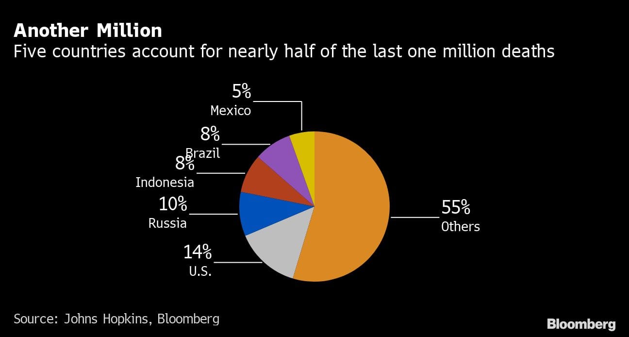 The U.S. alone accounted for 14% of the last million deaths — the highest share of any country. Russia was 10% of the total, while Indonesia and Brazil were each responsible for 8%.