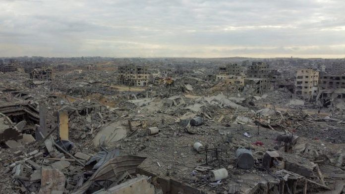 Swathes of Gaza are in ruins and the global hunger monitor said in August there was famine in the territory. Reuters video on Tuesday showed people clearing debris from streets and an aid truck moving through a market protected by armed men sitting on top.