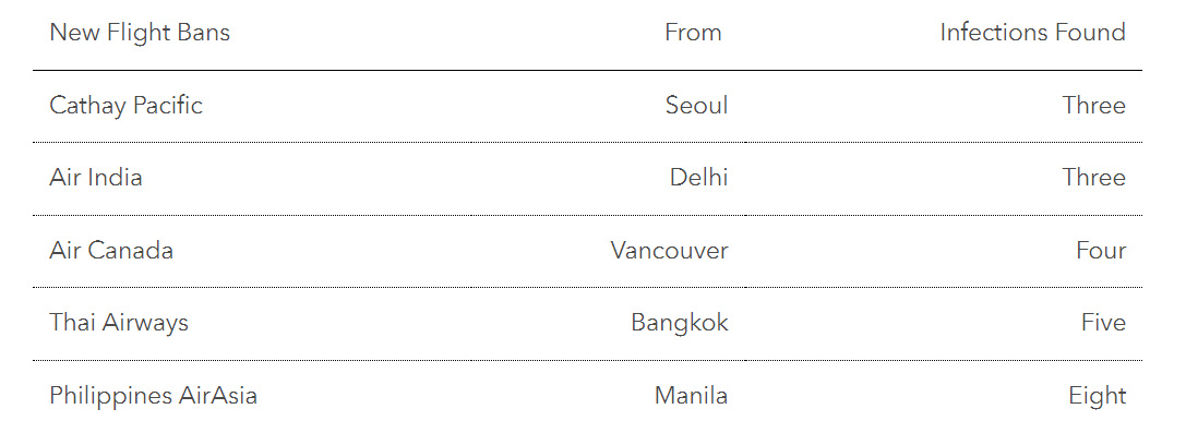 The latest of those specific suspensions included routes flown by Hong Kong’s embattled flag carrier Cathay Pacific Airways Ltd., as well as Air India Ltd., Air Canada, Thai Airways International Pcl and Philippines AirAsia.