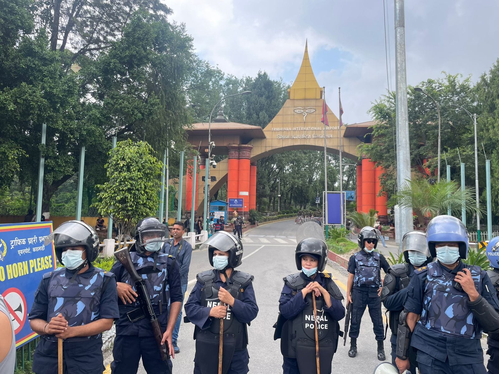 Kathmandu: Outside Tribhuvan International Airport, protesters stare down a line of