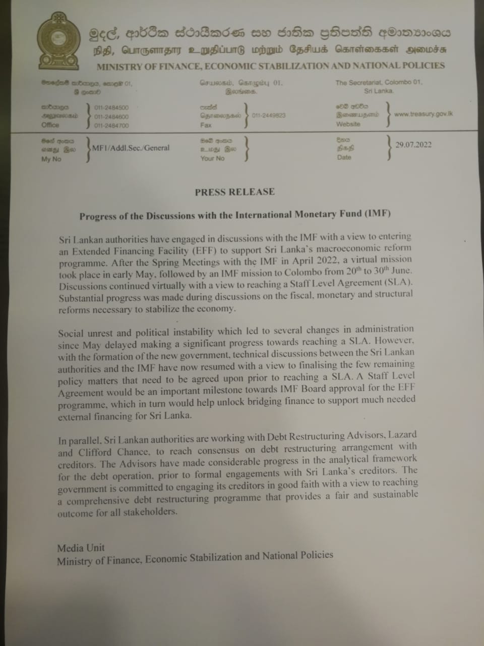 On 29 July, Sri Lanka’s finance ministry had issued a statement saying President Wickremesinghe and the IMF had resumed “technical discussions”.