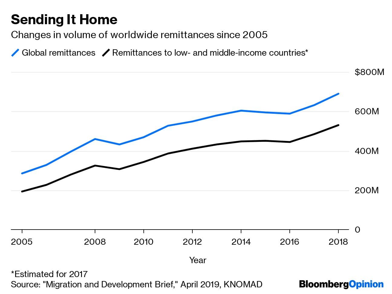 Then there are remittances. Immigrants working overseas often send money to their families back home. Given the lower prices in developing countries, these remittances can make a big impact. This type of transfer has grown in recent years: