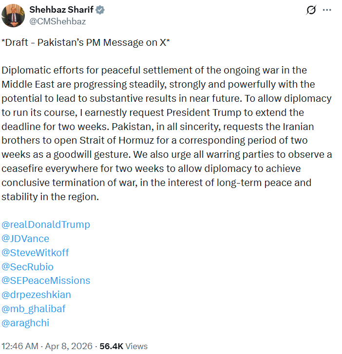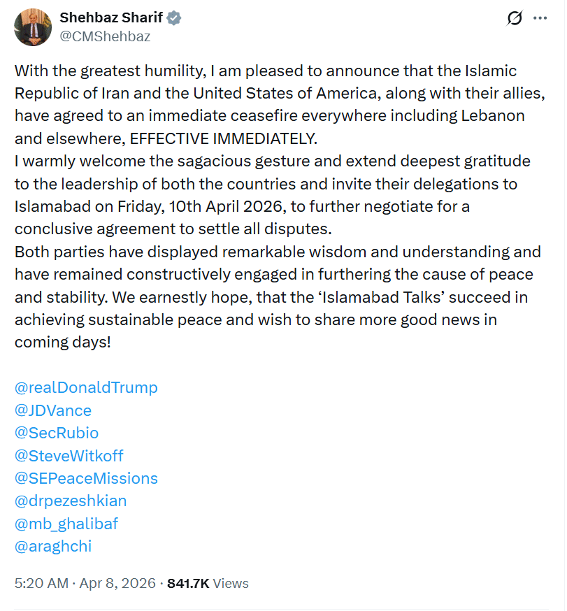 — Shehbaz Sharif (@CMShehbaz) April 8, 2026