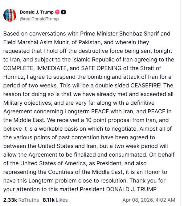 “Based on conversations with Prime Minister Shehbaz Sharif and Field Marshal Asim Munir, of Pakistan, and wherein they requested that I hold off the destructive force being sent tonight to Iran, and subject to the Islamic Republic of Iran agreeing to the COMPLETE, IMMEDIATE, and SAFE OPENING of the Strait of Hormuz, I agree to suspend the bombing and attack of Iran for a period of two weeks,” the US President wrote.