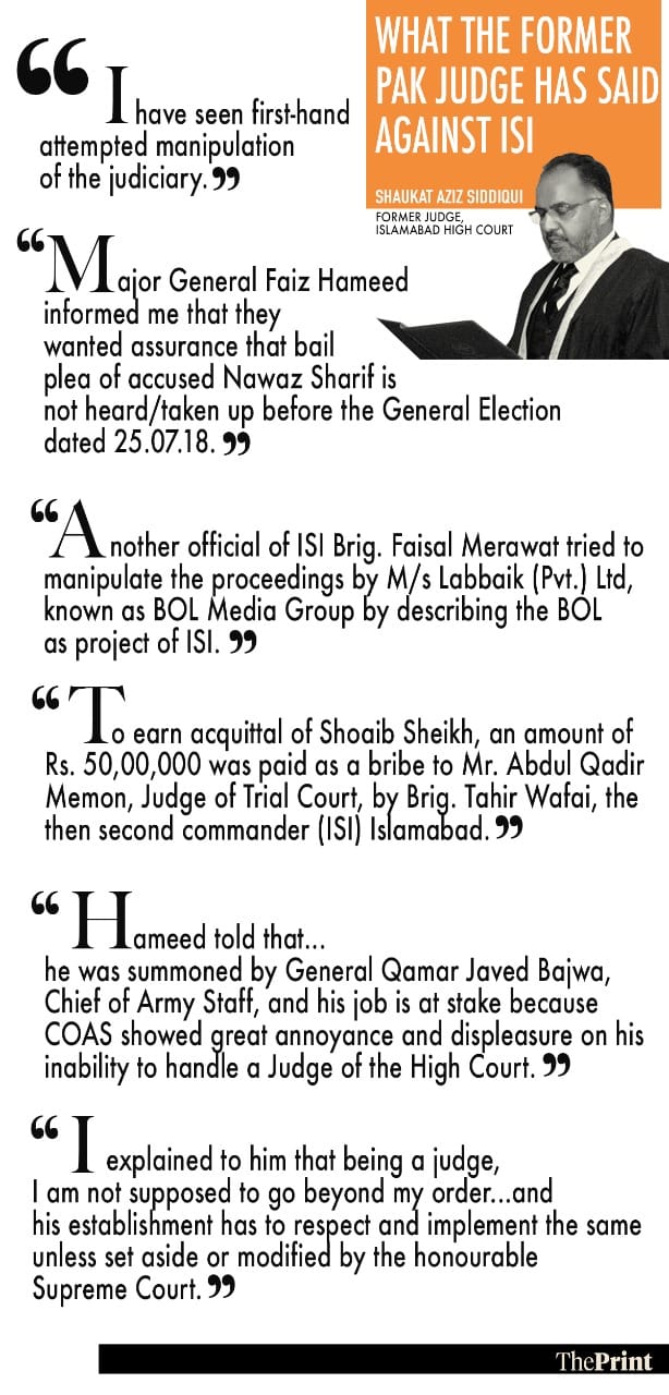 In the latest such incident, a former judge of the Islamabad High Court, Shaukat Aziz Siddiqui, has alleged that ISI Director General Lt Gen. Faiz Hameed and other military officers visited his residence to try and “manipulate” case proceedings back in 2018.