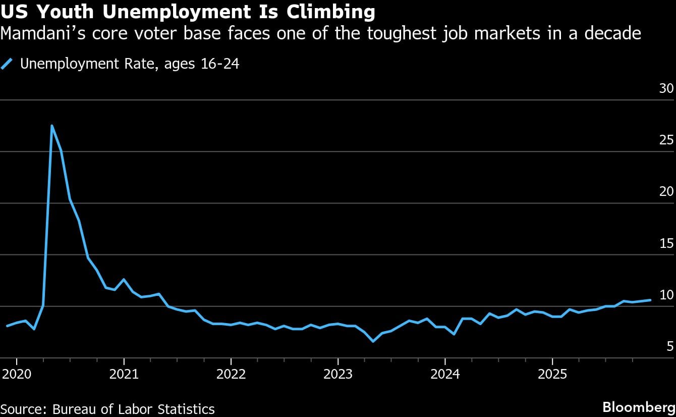 Young voters and volunteers fueled the 34-year-old Mamdani’s fast rise from a relatively unknown Queens assemblyman to mayor-elect of America’s largest city. A lot of them had time on their hands: New Yorkers aged 16 to 24 faced a 13.2% unemployment rate in 2024, 3.6 percentage points higher than in 2019, according to a May report from the New York state comptroller.
