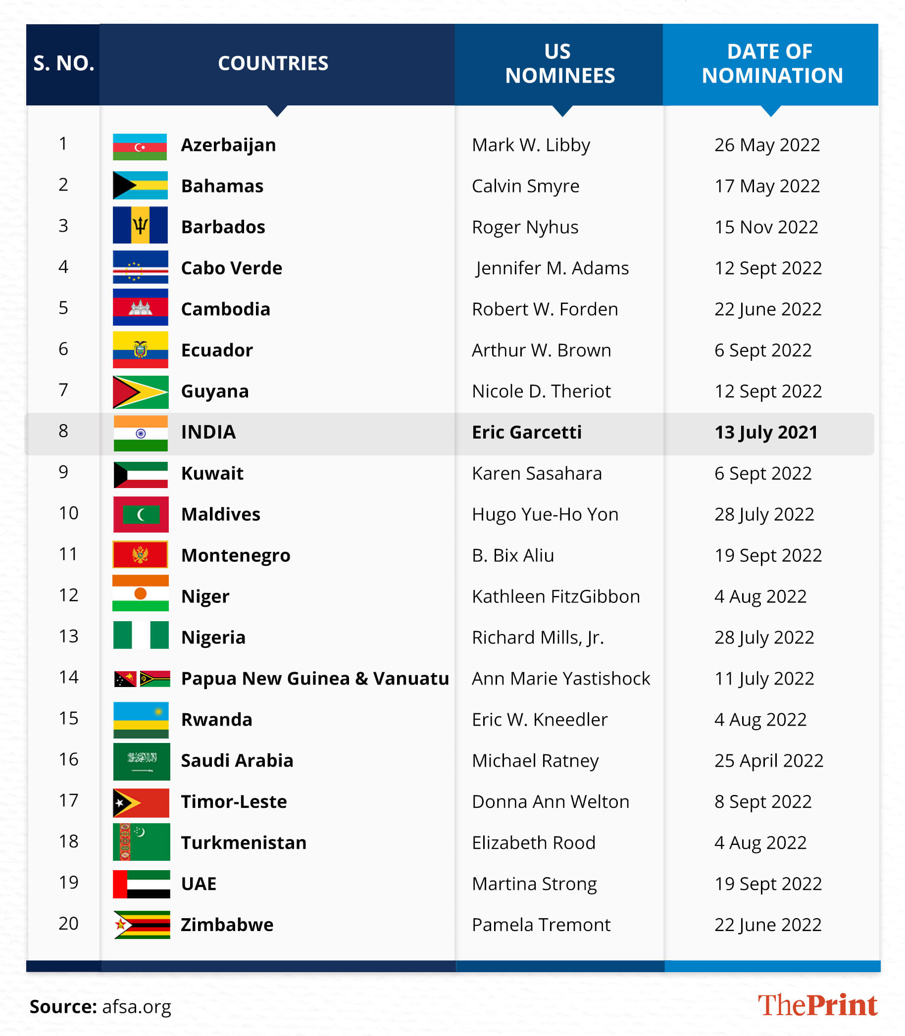 Of 20 ambassadorial nominees who are awaiting confirmation from the Senate, Garcetti’s case has been pending the longest — 16 months, according to ThePrint’s analysis of data from the American Foreign Service Association (AFSA), the professional association of the US Foreign Service.