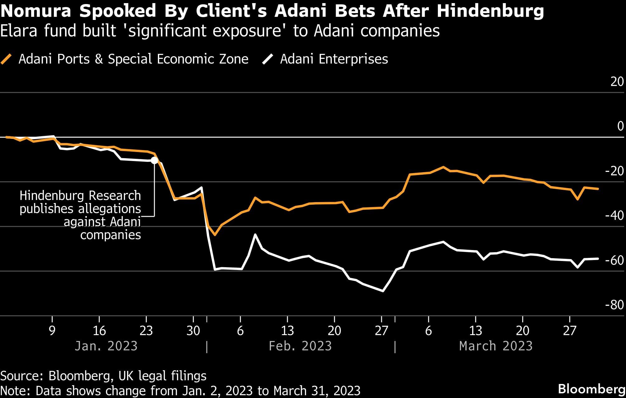 The Elara fund, known as Oyster Bay Fund Ltd., borrowed from Nomura for stock bets on Adani Enterprises Ltd. and Adani Ports & Special Economic Zone Ltd., according to High Court filings from the case. Shares in those companies plunged after a January 2023 report by Hindenburg Research accused Adani’s empire of “brazen stock manipulation” and alleged Elara was involved.