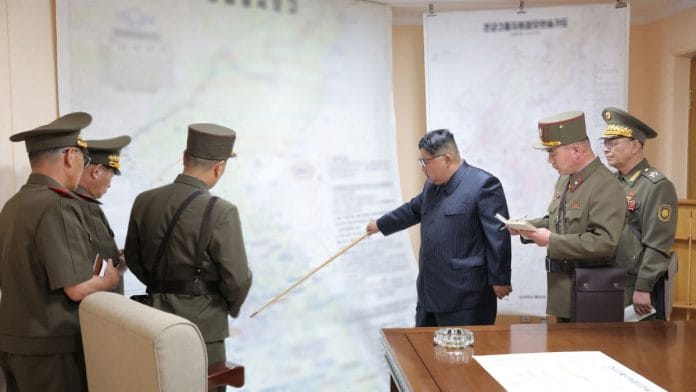 The simulation included frontline and strategic reserve artillery forces, plans for forming a front behind the enemy lines, disrupting the entrance of “outside armed forces” into the conflict, and “making simultaneous super-intense strikes at the pivotal military command centers, military ports, operational airfields and other important enemy military targets,” KCNA said.