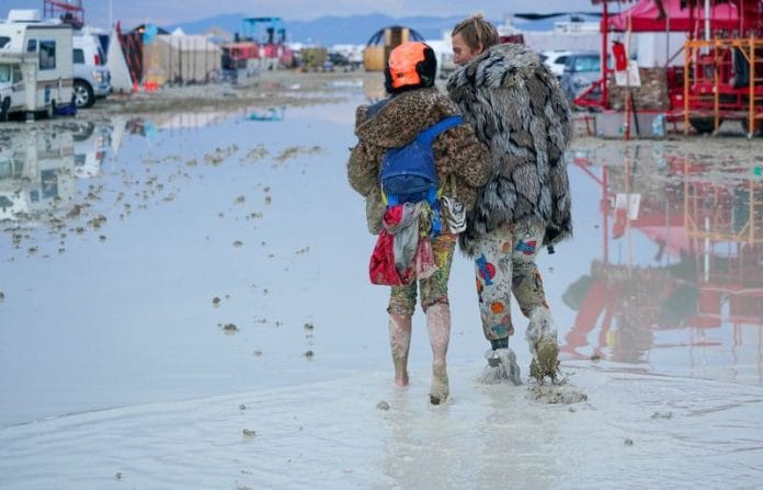 Videos shared on social media showed festival-goers in good spirits wading ankle deep in thick mud. The site is in Nevada’s Black Rock Desert, a large, flat, ancient lake bed known as a playa.