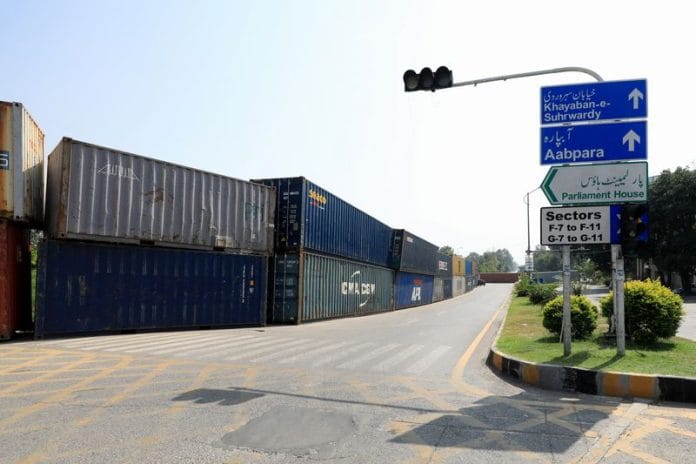 Shipping containers blocked entry points to Islamabad, guarded by large numbers of police and paramilitary troops.