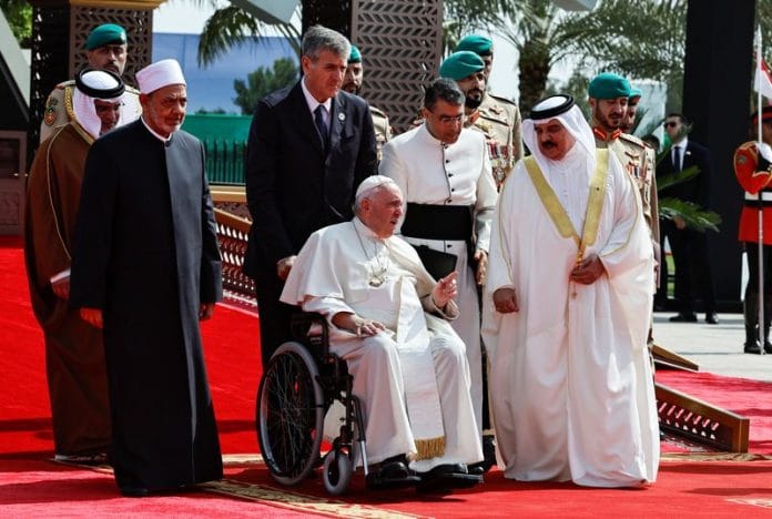 On Friday afternoon, he was due to address Bahrain’s Muslim Council of Elders and then preside at a prayer service at the cathedral of Our Lady of Arabia, one of two churches serving Bahrain’s tiny Catholic community of about 160,000.