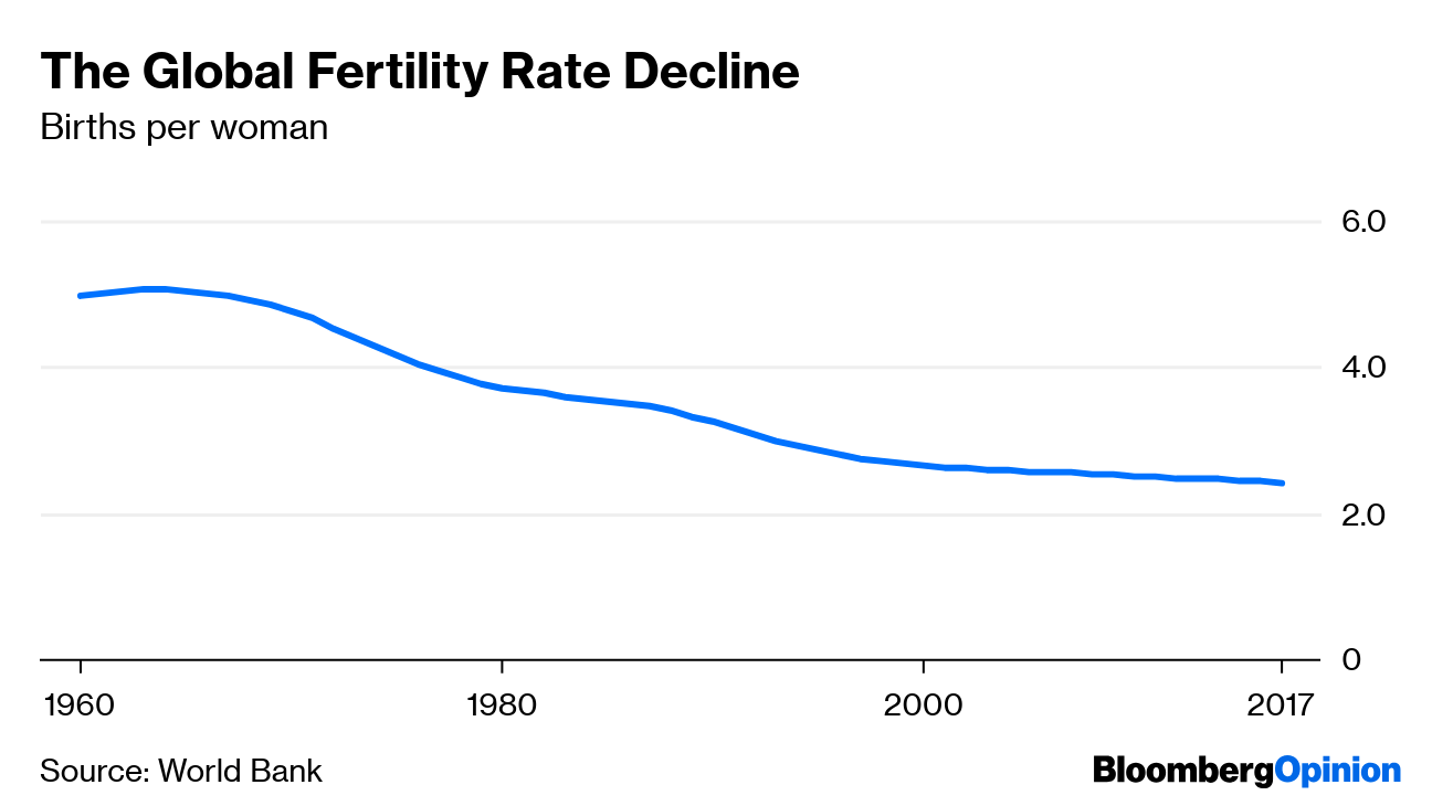 Bricker and Ibbitson’s forecast of a coming population decline is not grabbed out of thin air. In affluent countries and a lot of not-so-affluent ones, population growth is slowing and in some cases going into reverse, thanks to fertility rates that have fallen below the 2.1 births per woman that keeps population steady over time. Worldwide, the fertility rate is now an estimated 2.4 births per woman — less than half what it was when Ehrlich issued his warning in 1968 — and falling.