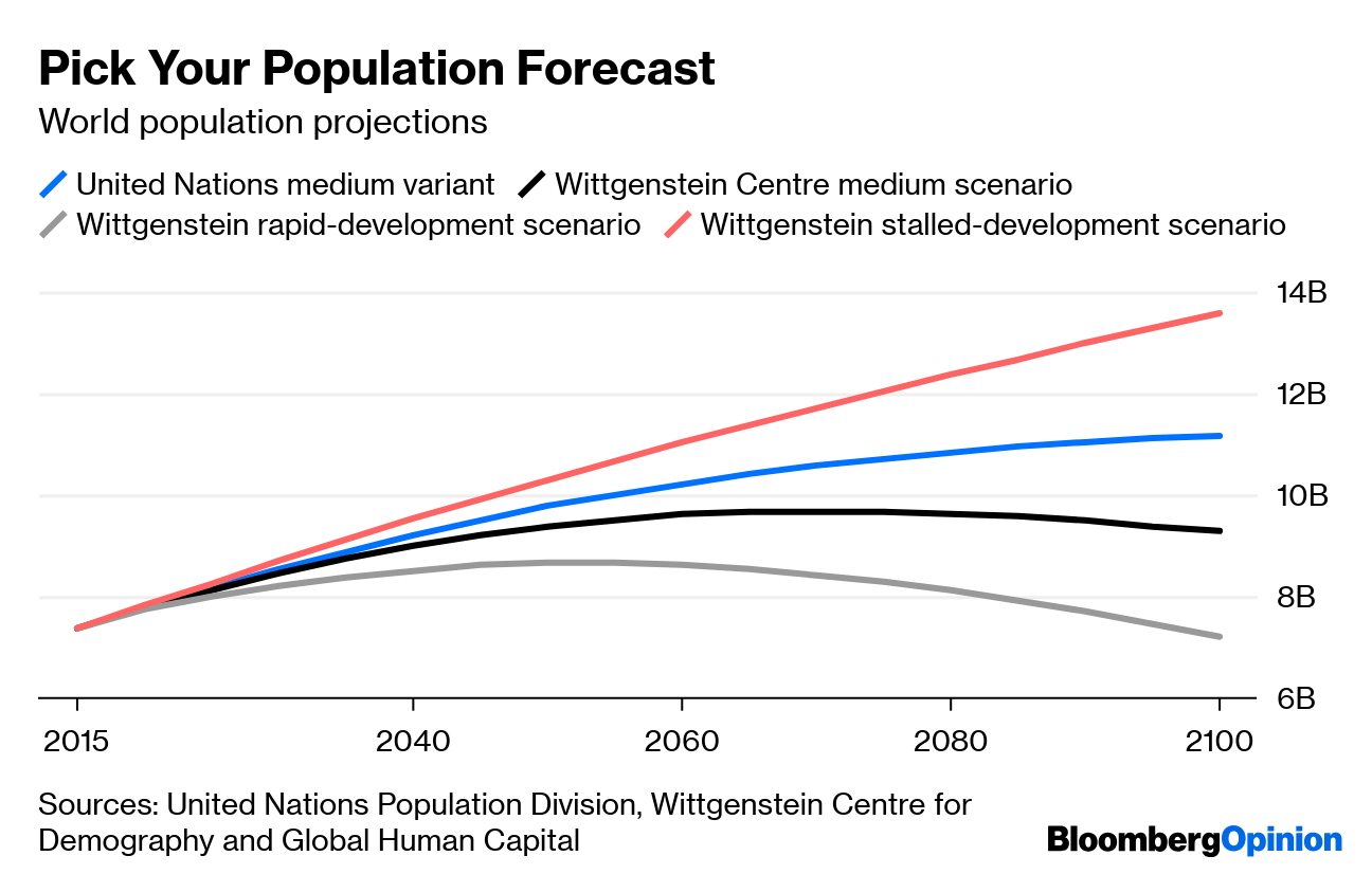 Below-replacement fertility rates don’t immediately translate into population declines — lengthening lifespans work against that, and if a country has a large enough cohort of young people, even with smaller families their kids will keep driving population higher for a while. The United Nations’ “medium variant” population projection from 2017 assumes that the global fertility rate will drop below replacement by 2070, but that world population will keep growing through the end of the century. Still, past UN projections have consistently overshot (albeit not by a huge amount), and one can’t really fault Bricker and Ibbitson for choosing instead to go with the projections of Austria’s Wittgenstein Centre for Demography and Global Human Capital, which depict global population peaking in 2070 in the medium scenario and in 2045 in the “rapid development” scenario, in which urbanization and educational gains in developing countries drive even quicker fertility declines.
