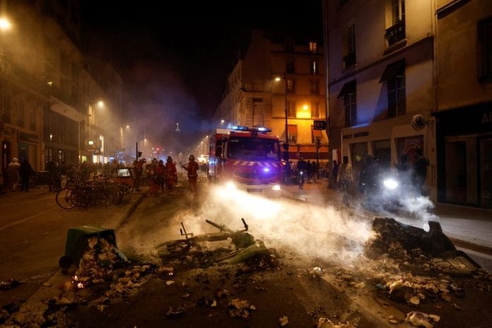 Rubbish bins and barricades were set ablaze on Tuesday in spontaneous protests in Paris and elsewhere across the country in a sixth night of scuffles with police.
