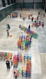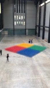 We were watching from a gallery above the Turbine Hall floor. Araeen was visibly happy that the display of 400 brightly coloured lattice-construction cubes were giving so much constructive pleasure to more than 100 children (right) and a few adults – with more queuing to get access to the floor.