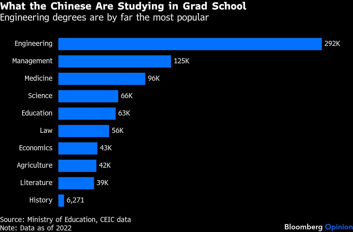 First, Xi’s focus on higher education is finally paying off. These days, roughly 40% of high-school graduates go to university, versus 10% in 2000. Engineering is by far the most popular major for post-graduate studies. As a result, the nation’s talent pool has greatly expanded: Between 2000 and 2020, the number of engineers ballooned from 5.2 million to 17.7 million; in 2022, 47% of the world’s top 20th percentile AI researchers finished their undergraduate studies in China, well above the 18% share from the US.