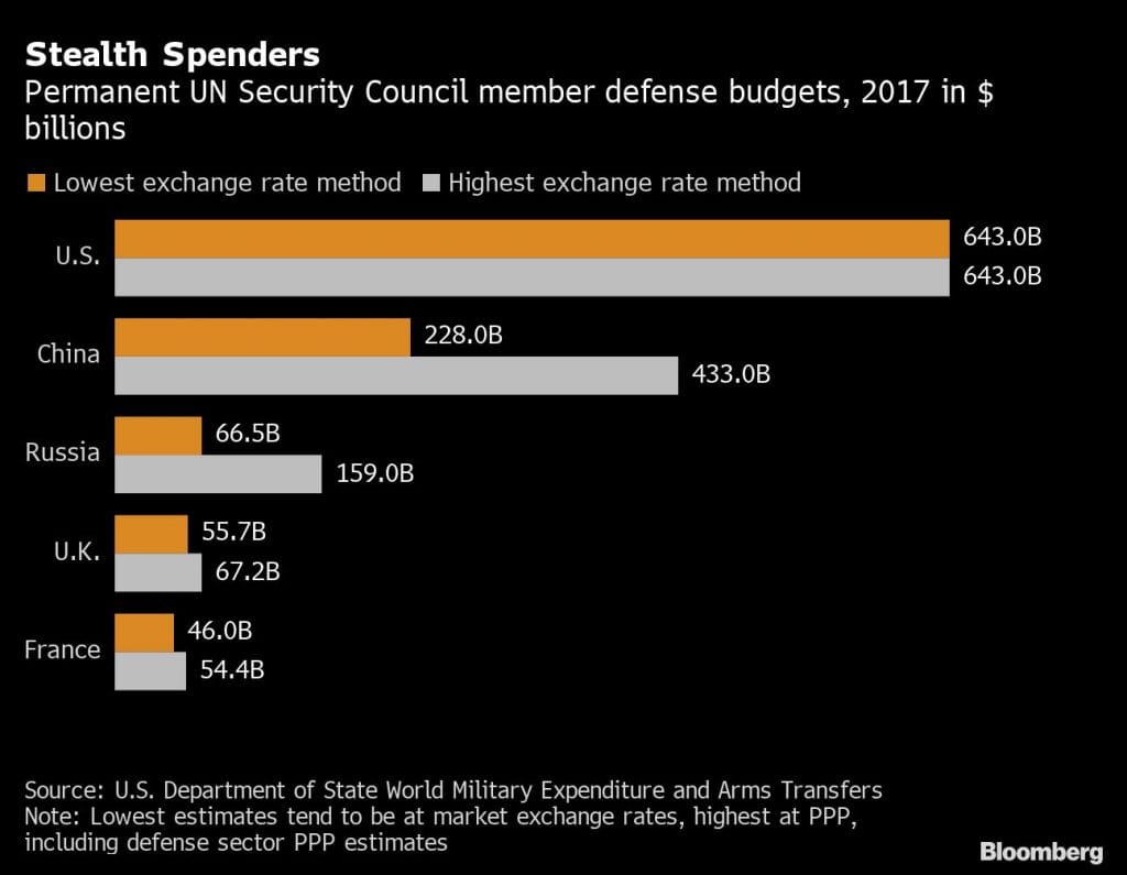 A U.S. State Department index comparing defense budgets around the world stresses the lack of clarity and gives broad spreads for each country — from $228 billion to $433 billion for China, and $66.5 billion to $159 billion for Russia in 2017, the latest available data.