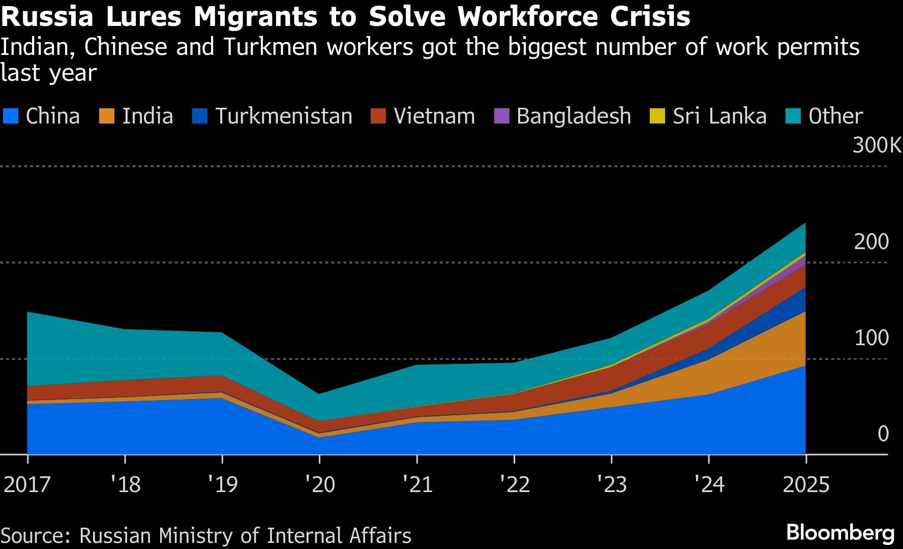 Even before the deal, the number of employment permits Russia issued for Indians jumped to more than 56,000 last year from roughly 5,000 in 2021. The total number of work permits given to foreigners rose to more than 240,000 in 2025, the highest since at least 2017, statistics from the Ministry of Internal Affairs show. While authorizations have jumped for the former Soviet republic of Turkmenistan, much of the growth in foreign labor comes from further abroad — including India, Bangladesh, Sri Lanka and China.