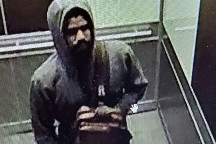 The suspect had a mask over his face and nose and was wearing a sweatshirt and carrying a brown backpack.