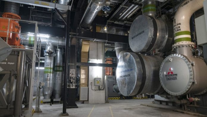 At its heart are two plants that chill water to 4.5 degrees Celsius. To ensure the temperature is consistent, bubbles are generated to stir the water, which is then delivered to the buildings via the insulated underground pipes to cool air that is circulated through each tower. The water, now at 13C, is pumped back to the chiller and the cycle repeats. Heat from the process is released into the outside air through a large cooling tower above the ground.