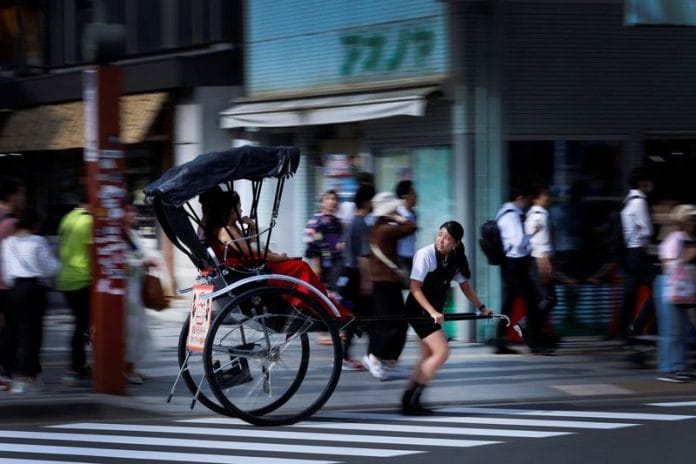 Rickshaw puller Yuka Akimoto breathlessly dashes down the streets of Tokyo under a scorching summer sun, two French tourists enjoying the sights from the back of her black, two-wheeled cart.