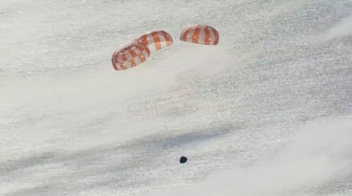 NASA’s gumdrop-shaped Orion capsule, dubbed Integrity, parachuted gently into the sea off the Southern California coast shortly after 5 p.m. PT, concluding a mission that took the astronauts deeper into space than anyone had flown before.