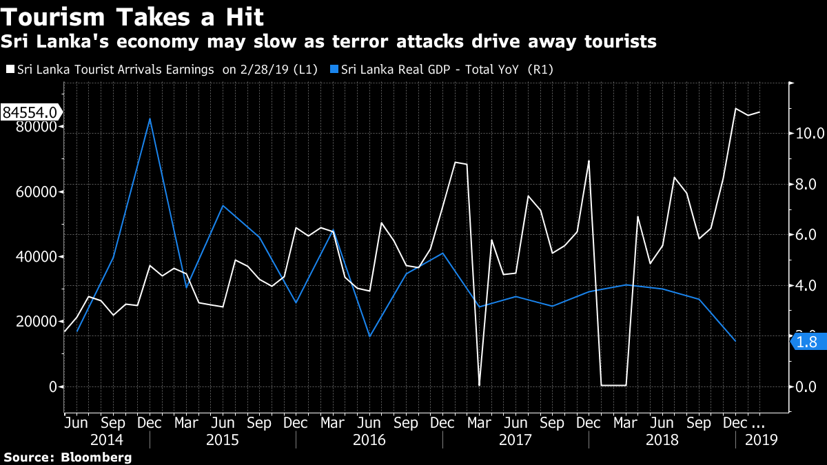 The terror attacks are poised to hit tourism, which accounts for 5 percent of the $87 billion economy, as visitors flee from the nation famous for the Temple of Tooth, Dambulla Caves and coconut-fringed beaches. Sri Lanka has been struggling to revive growth following a three-decade long civil conflict that ended in 2009 and political turmoil last year. Arrivals have increased more than fivefold since the war ended and revenue from the industry is near a record.