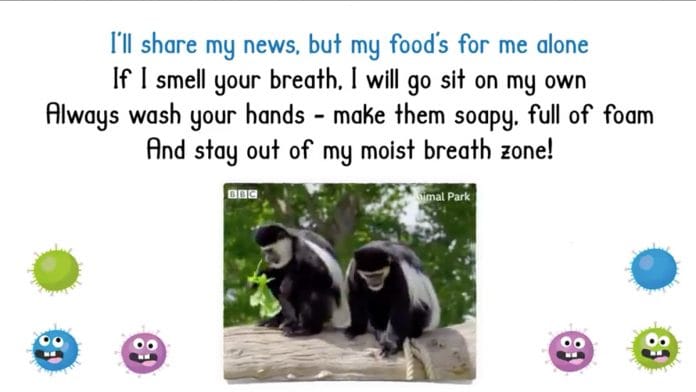 It also encourages children to wash their hands and to maintain adequate distance — “I’ll share my news, but my food’s for me alone. If I smell your breath, I will go sit on my own. Always wash your hands — make them soapy, full of foam.”