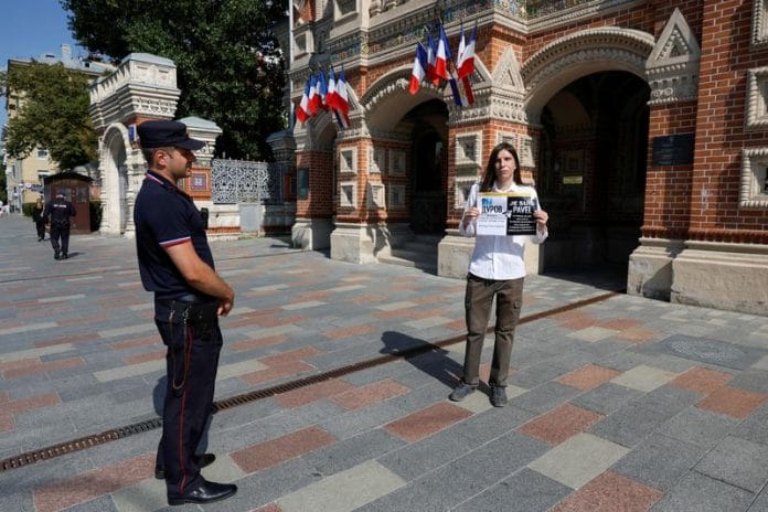 Outside the French embassy in Moscow, a lone protester held up a sign reading: “Liberté pour Pavel Durov”.