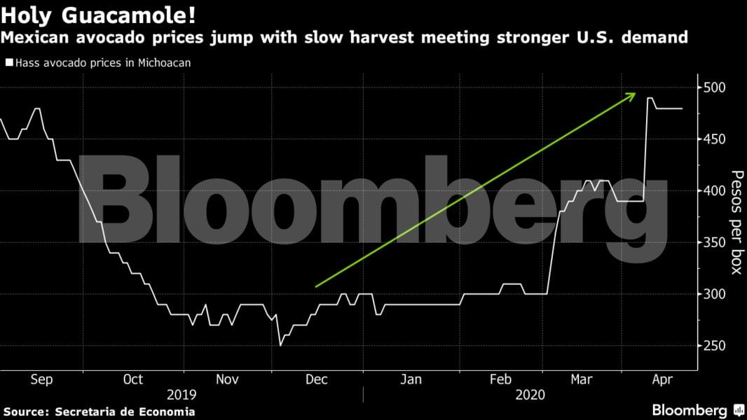 But it turns out avocado toast and guacamole are proving to be stay-at-home favorites. Demand has been much higher than the growers were expecting, and that’s sent prices surging. A box of Hass avocados from the state of Michoacan, Mexico’s biggest producer, cost about 480 pesos ($19) on April 24, according to the government. That’s up about 60% from 300 in early March.