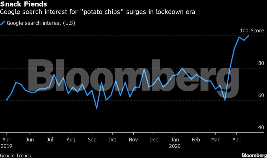 Snack consumption is also going up. That’s partly because people are stuck at home, but also because they’re spending more time doing activities that lend to munching, like binge-watching “Tiger King” on Netflix.