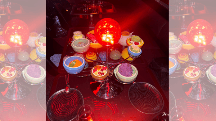 Desserts go even further in evoking outer space. Served on a structure meant to reproduce a model of the solar system, each “planet” conceals a different surprise from the menu: sweet and sour mochi, banana pudding, a jewel-like fruit platter, and ice cream in an orange-skin shell. As the final course lands, you’re left wondering: Is a meal at Woohoo a caricature of futuristic Dubai or a glimpse to where dining is headed?