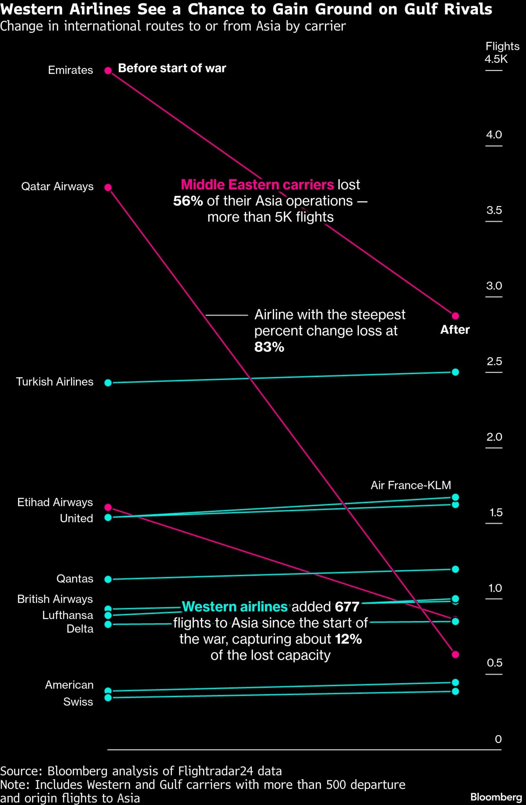 (1) Methodology note: Bloomberg analyzed 131,074 flight records between Feb. 1 and March 27, 2026 from Flightradar24, comparing trends before and after the US and Israeli attack on Iran that started Feb. 28. The data is limited to international widebody passenger flights among 21 airlines.Gulf Carriers: Emirates, Qatar Airways, Etihad AirwaysUS: United Airlines, Delta Air Lines, American AirlinesEurope: Air France-KLM, British Airways, Lufthansa, Turkish Airlines, Iberia, Swiss, TAP Air Portugal, ITA Airways, Brussels Airlines, SAS, Austrian Airlines, Martinair, Oceania, QantasAsia: Air India, IndiGo.