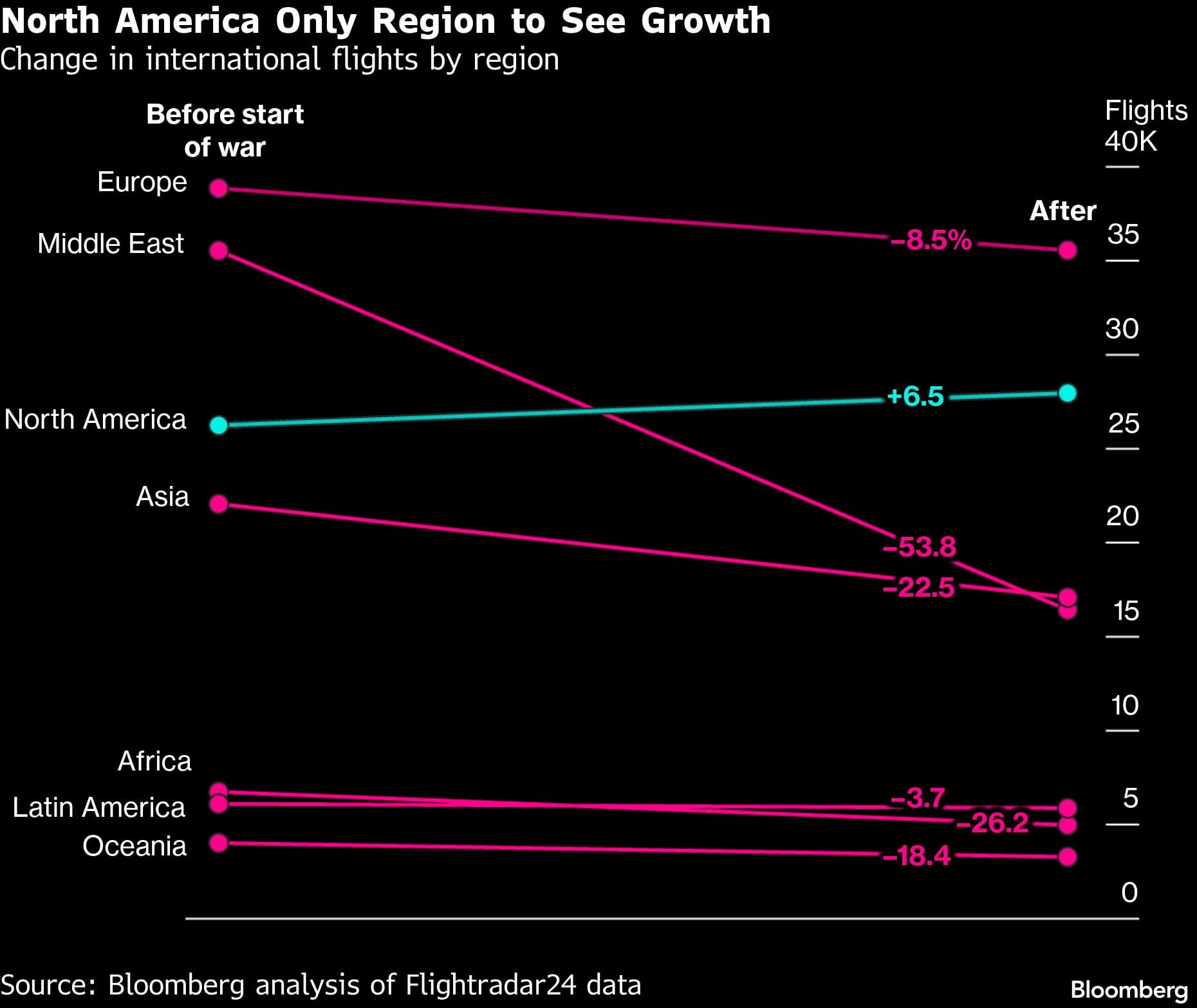 Bloomberg analyzed widebody flights across 21 major airlines in the month before and after the war began, using data from tracking firm Flightradar24.(1)