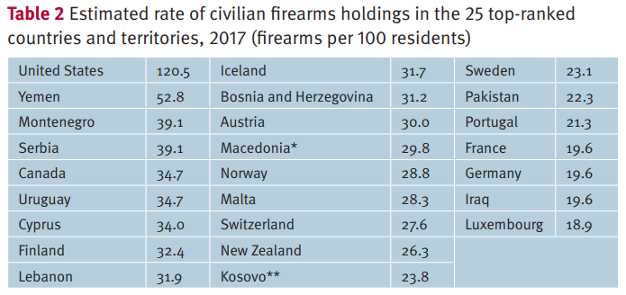 National ownership rates vary hugely, from about 120 firearms for every 100 residents in the US to less than one firearm for every 100 residents in Indonesia, Japan and Malawi.