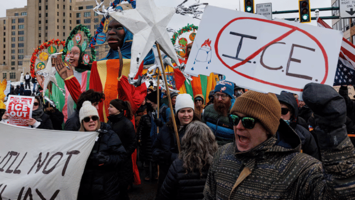 Minneapolis: Tens of thousands of people marched through Minneapolis on Saturday to decry the fatal shooting of a woman by a U.S. immigration agent, part of more than 1,000 rallies planned nationwide this weekend against the federal government’s deportation drive.