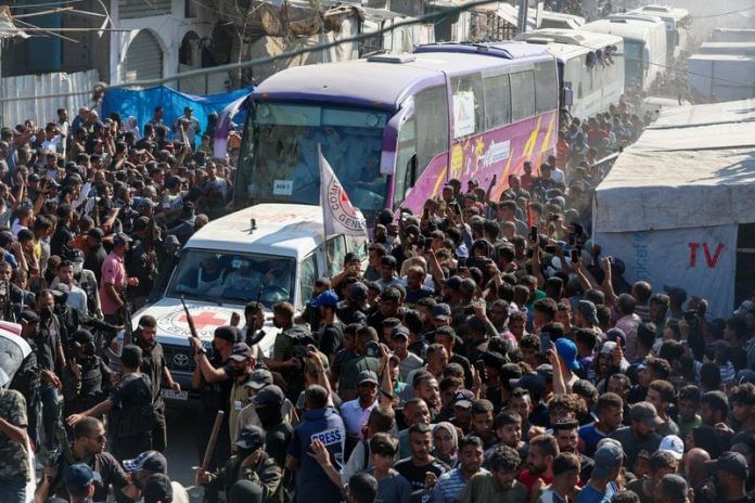 Freed prisoners arrived in buses, some of them posing from the windows, flashing V-for-Victory signs. The appearance of armed and masked Hamas fighters at the scene underscored the difficulty of resolving Israel’s demand that they disarm.