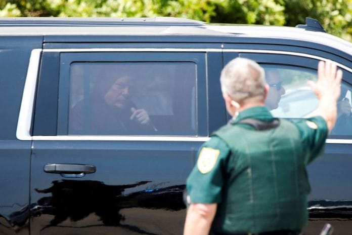 A motorcade of several vehicles transported Trump from his Mar-a-Lago estate in Palm Beach to the airport in nearby West Palm Beach. Trump and members of his entourage climbed a set of stairs and entered his plane, painted in red, white and blue with TRUMP in big letters on the side and an image of the American flag on the tail.