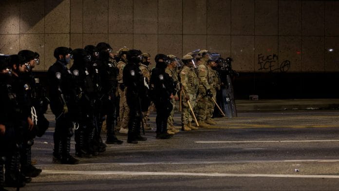 The Trump administration has denied that troops are engaging in law enforcement, saying that they are instead protecting federal buildings and personnel, including U.S. Immigration and Customs Enforcement officers.