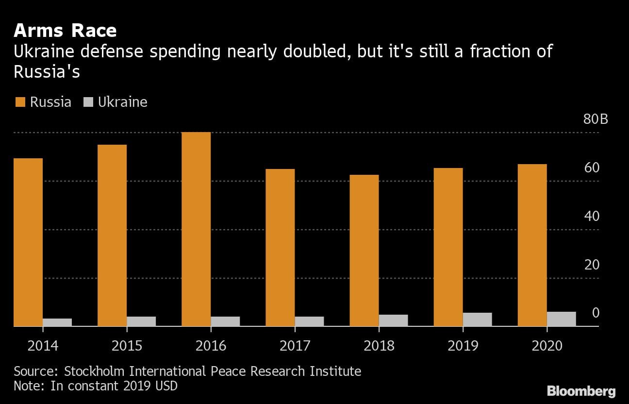 Instead, as fears rise in the U.S. and Europe of a potential invasion by President Vladimir Putin, Ukraine finds its army dwarfed by Russia’s forces and its spending power. The Russian president has sustained his latest troop buildup on the border, saying the North Atlantic Treaty Organization must reduce its presence in the region.