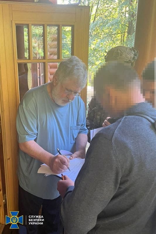 The security service published pictures of a group of detectives at the door of his home, with Kolomoisky receiving and signing documents.