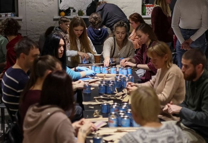 When Nazarova secured 10,000 cans from a factory in northern Ukraine a few weeks ago, she thought it would take months to turn them all into trench candles, but volunteers completed the task during an event on Sunday at a Kyiv cultural center, singing Ukrainian folk songs as they worked.