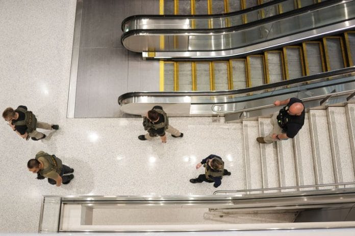 On Monday morning, U.S. Immigration and Customs Enforcement agents wearing flak jackets and pistols stood guard in airports in Atlanta, New York and New Jersey, according to Reuters witnesses. They were not wearing masks, which they had done regularly while carrying out Trump’s immigration crackdown in major cities.
