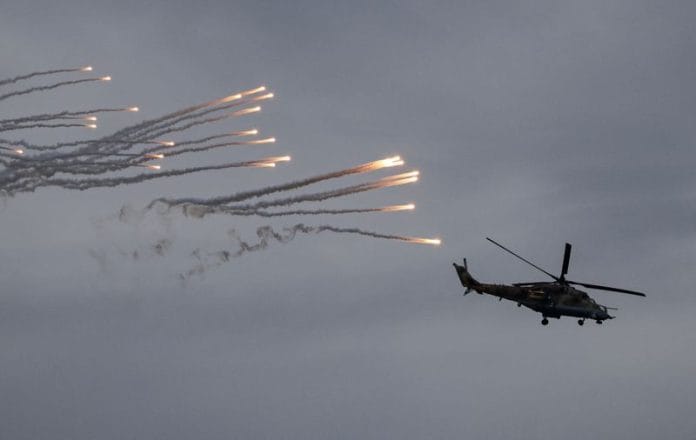 Fighter jets, attack drones and helicopters flew over a training ground hemmed in by trees as infantry practised firing automatic weapons, mortars and missile systems and riding into combat on motorcycles.