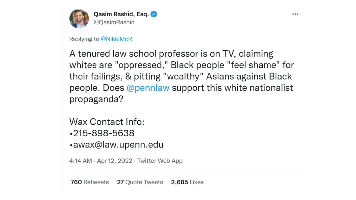 “In my view, Professor Wax’s repeated conduct and behavior and statements are both serious and have caused harm and are inconsistent with the norms and expectations of a faculty member at the University of Pennsylvania,” he said.
