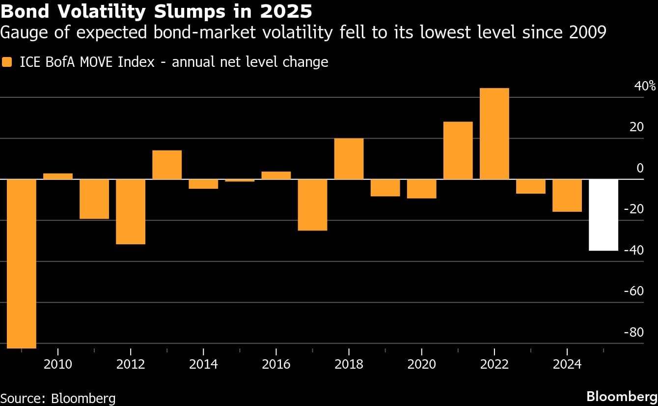 The scale of last year’s rally helps explain why US stocks returned about 18%, marking a third consecutive year of double-digit gains, while global equities delivered roughly 23%. Government bonds also advanced, with global Treasuries up nearly 7% as the Federal Reserve cut interest rates three times.