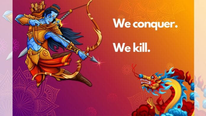 The illustration is of Rama, believed to be the seventh reincarnation of Vishnu in Hindu mythology, drawing a bow as it targets a Chinese dragon. The text, “We Conquer, We Kill”, accompanies the illustration.